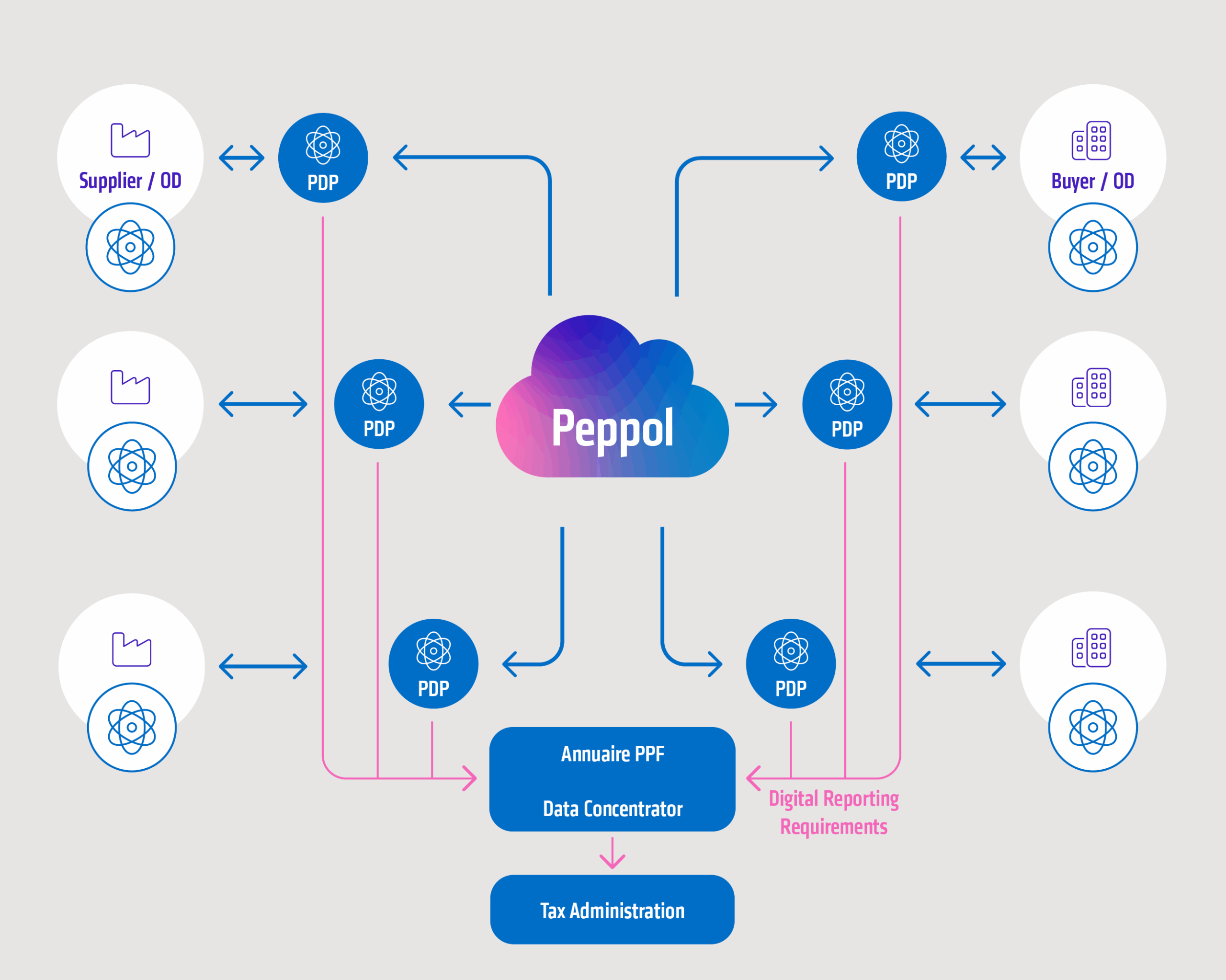 Französische Unternehmen (also Kunden und Lieferanten) müssen sich für eine oder mehrere zertifizierte PDPs entscheiden. Die Unternehmen senden und empfangen ihre Rechnungen über diese PDPs. Die PDPs der Rechnungssteller validieren die Rechnungen auf ihre Richtigkeit und leiten die Rechnung an Peppol weiter sowie die Rechnung- und Steuerdaten an PPF. Von Peppol wird die Rechnung an die PDPs der Rechnungsempfänger geleitet. Diese wiederum übertragen die Rechnungen an das jeweilige Unternehmen. Anschließend leitet der PPF die gesammelten Steuerdaten an DGFiP weiter.