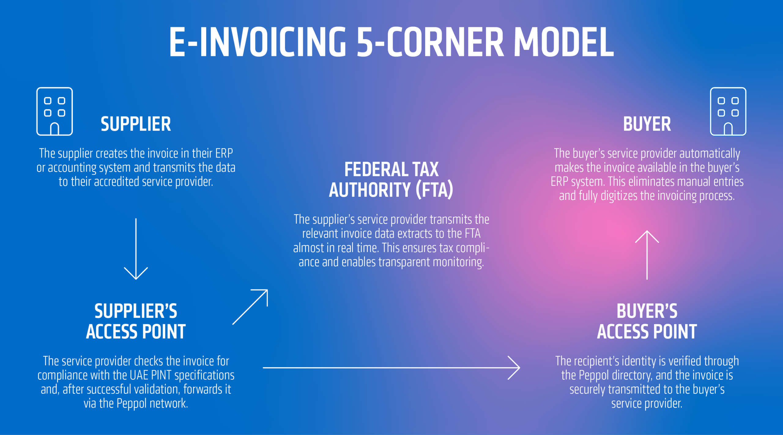 This eliminates the need for manual entries and completely digitizes the invoicing process. - Corner 5 – Federal Tax Authority (FTA):