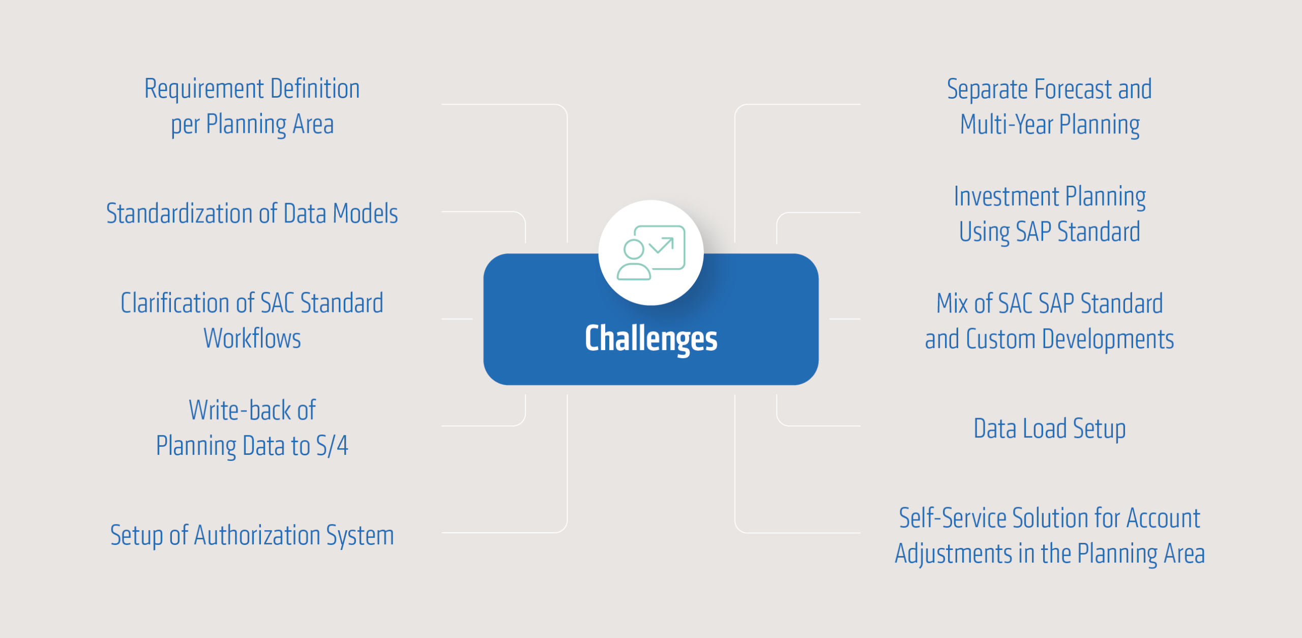 In the workshop-based analysis of customer requirements, each of the aforementioned planning areas was discussed, defined at the field level, and analyzed and documented with regard to specific requirements. A particular challenge was to integrate the different requirements of quarterly-based forecast planning for the next planning year and multi-year planning for the next five years into a single solution.
