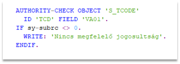 Az AUTHORITY-CHECK parancsot ABAP programokban használják annak ellenőrzésére, hogy egy felhasználó rendelkezik-e a szükséges jogosultságokkal. Példa: