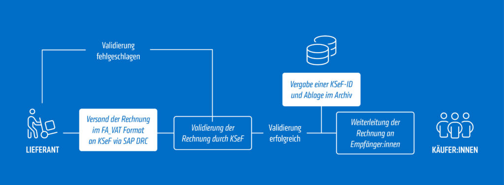 Dabei werden die relevanten Rechnungsdaten automatisch aus dem SAP-System extrahiert, in das von den polnischen Steuerbehörden vorgeschriebene FA_VAT-Format konvertiert und über eine gesicherte Schnittstelle (API) an das KSeF-Portal übermittelt. Rückmeldungen wie Validierungsfehler, Empfangsbestätigungen oder Statusinformationen fließen direkt zurück ins System und können dort automatisiert weiterverarbeitet werden.