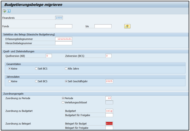 Da bei der Migration der Budgetbelege im BCS-Beleg das Feld „Beleg klass. Budgetierung“ mit der migrierten Belegnummer aus der klassischen Budgetierung versorgt wird, können Belege eines Geschäftsjahres nur einmal migriert werden. Bei einer fehlerhaften Migration dürfen daher die BCS Budgetbelege nicht über die TAC FMDOCREV storniert, sondern müssen über die Option „Migration zurücksetzen“ gelöscht werden.