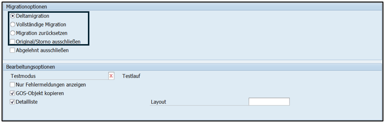Grundsätzlich sollte des Weiteren die Option „Vollständige Migration“ gewählt werden, damit alle Belege migriert werden. Die Deltamigration gleicht sonst über die vorher erklärte Verknüpfung zur klassischen Budgetierung ab, ob und welche Belege bereits migriert wurden und kann z. B. in den Fällen verwendet werden, wo nach erfolgter Budgetmigration noch nachträgliche Belege in der klassischen Budgetierung erzeugt wurden.