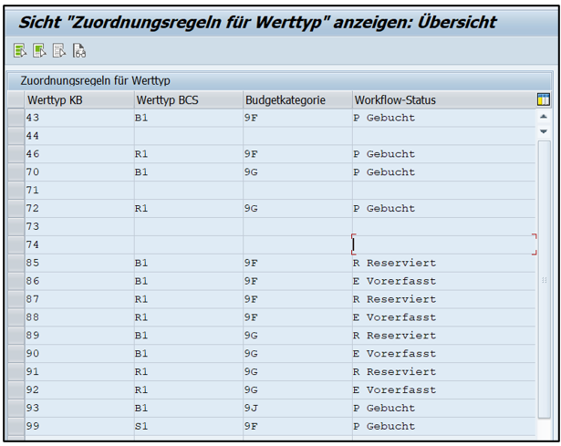 Die SAP liefert auch hier Standard-Werttypen mit einem Mapping auf BCS Werttyp Budget (B1) oder Freigabe (R1) in der jeweiligen Budgetkategorie 9F (Zahlungsbudget) und 9G (Verpflichtungsbudget) sowie dem Status, ob ein Beleg gebucht, vorerfasst oder reserviert ist, aus.